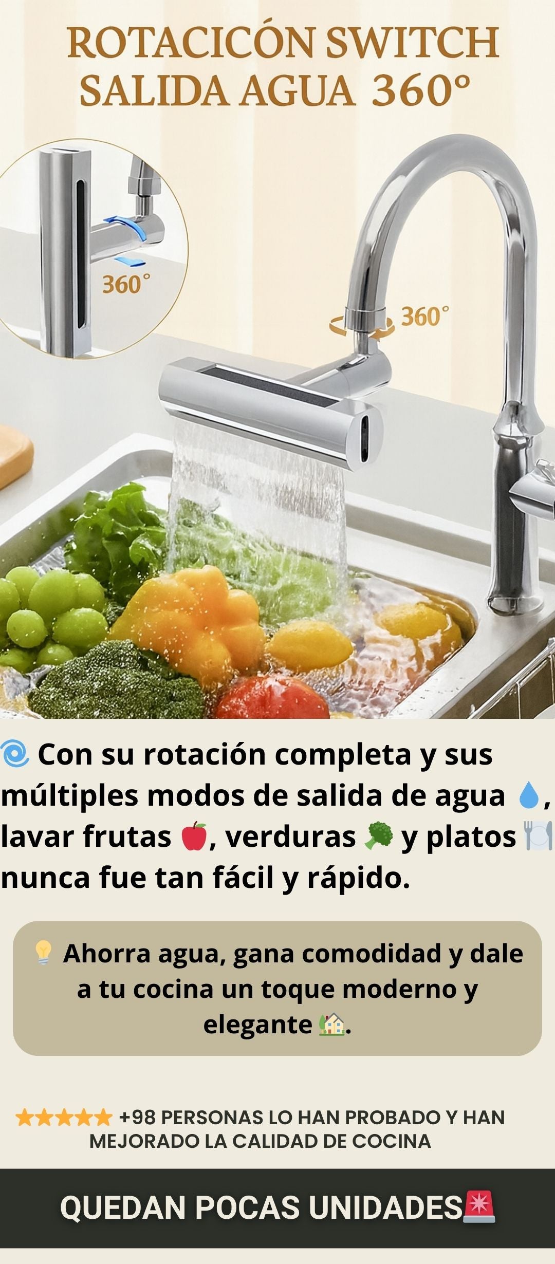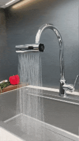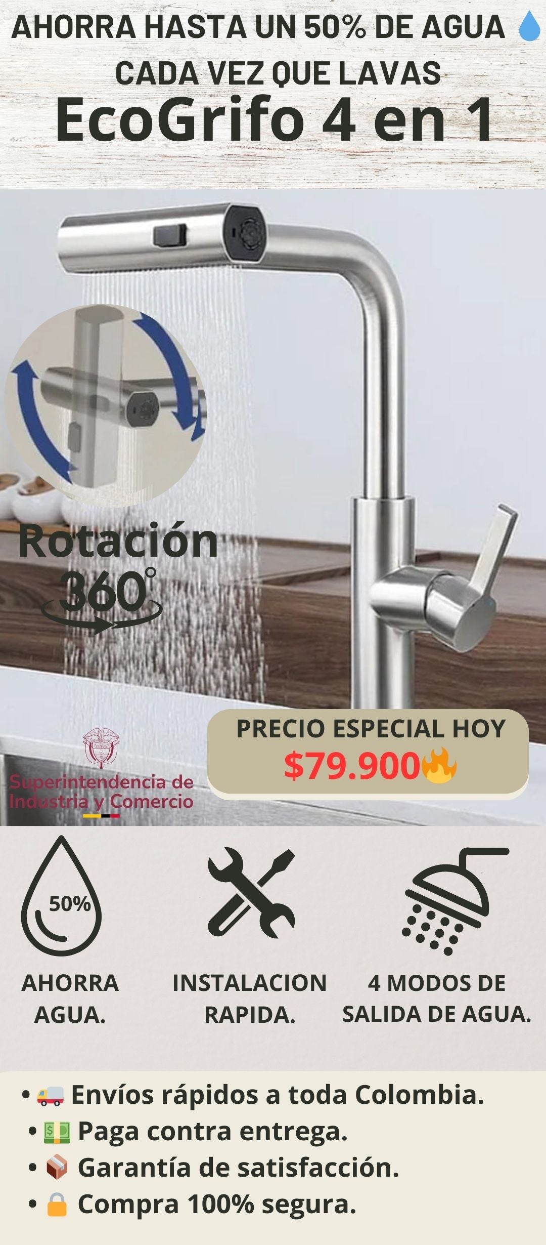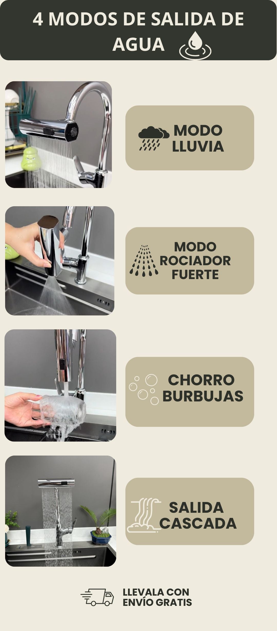 Se refiere a los cuatro modos de salida de agua que suele ofrecer este tipo de grifos: modo cascada, chorro estándar, spray (enjuague) y modo de presión intensificada (o ahorro). Esto permite adaptarse a distintas tareas en la cocina.